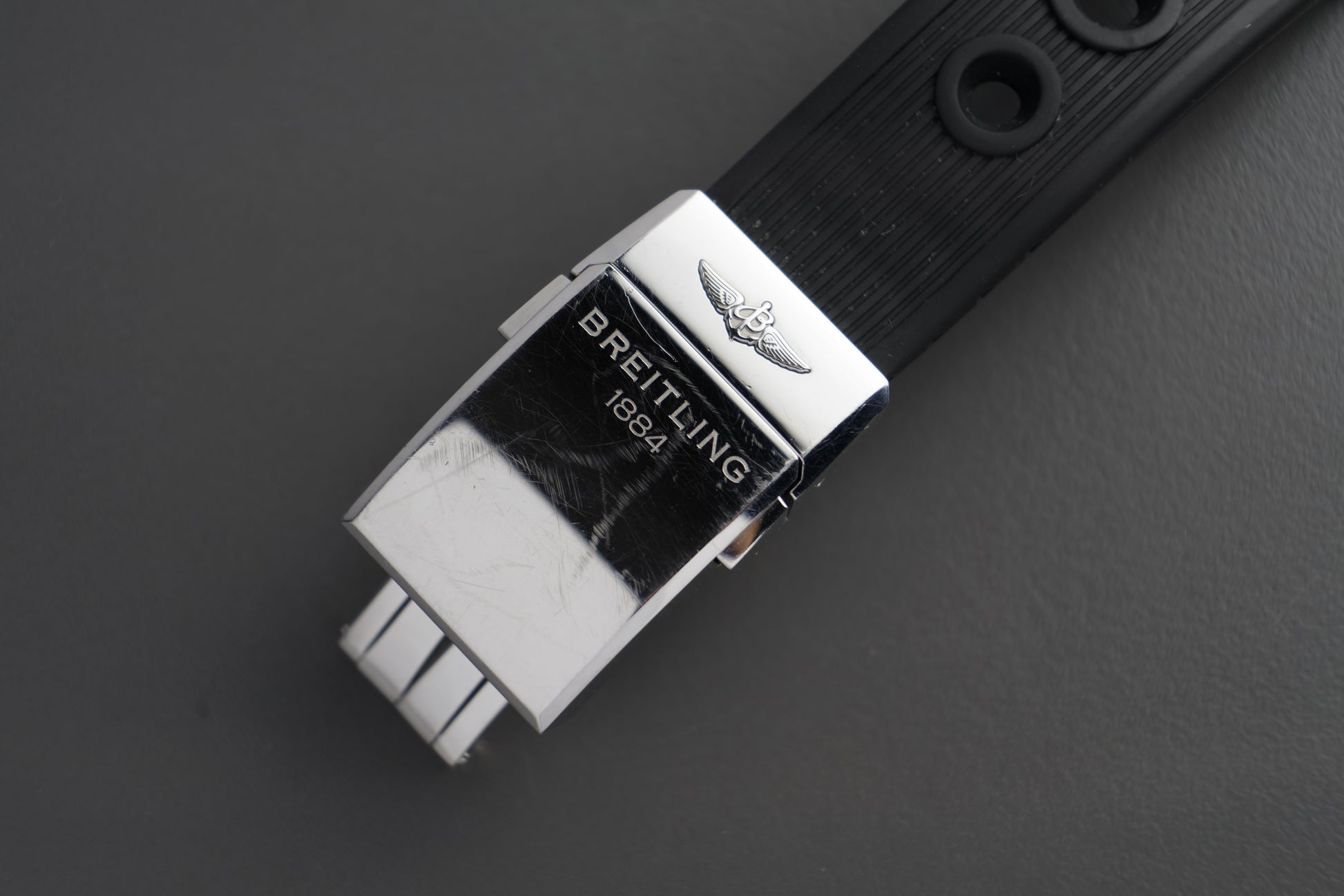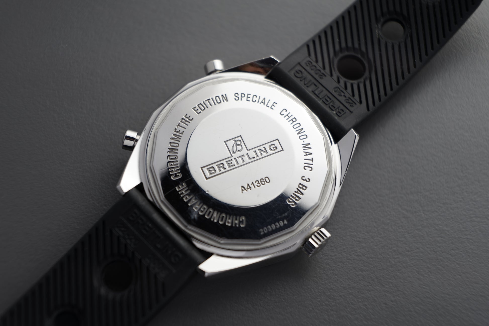 Hierbei handelt es sich um eine markante Breitling Chrono-Matic mit der Referenz A41360. Dieses Modell steht für die kraftvolle Designsprache von Breitling und überzeugt durch ihre außergewöhnliche Größe sowie ihre sportlich-technische Präsenz am Handgelenk.