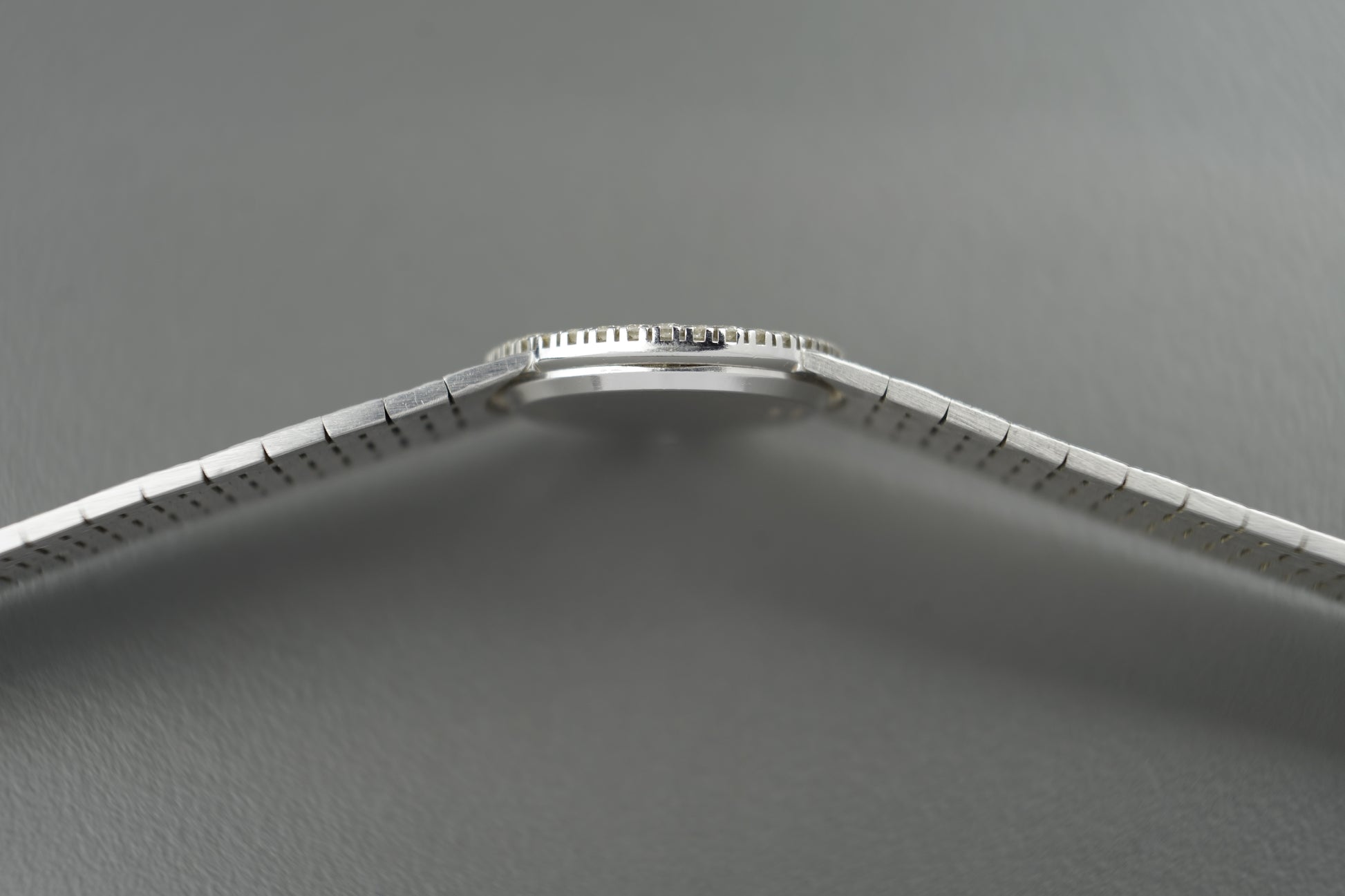 Das Band und Gehäuse sind aus massivem 18-karätigen Weißgold gefertigt. Auf der Lünette sind 36 Diamanten besetzt. Die flache Bauweise des Gehäuse sorgt für einen besonders angenehmen Tragekomfort und eine unglaublich elegante Präsenz am Handgelenk.