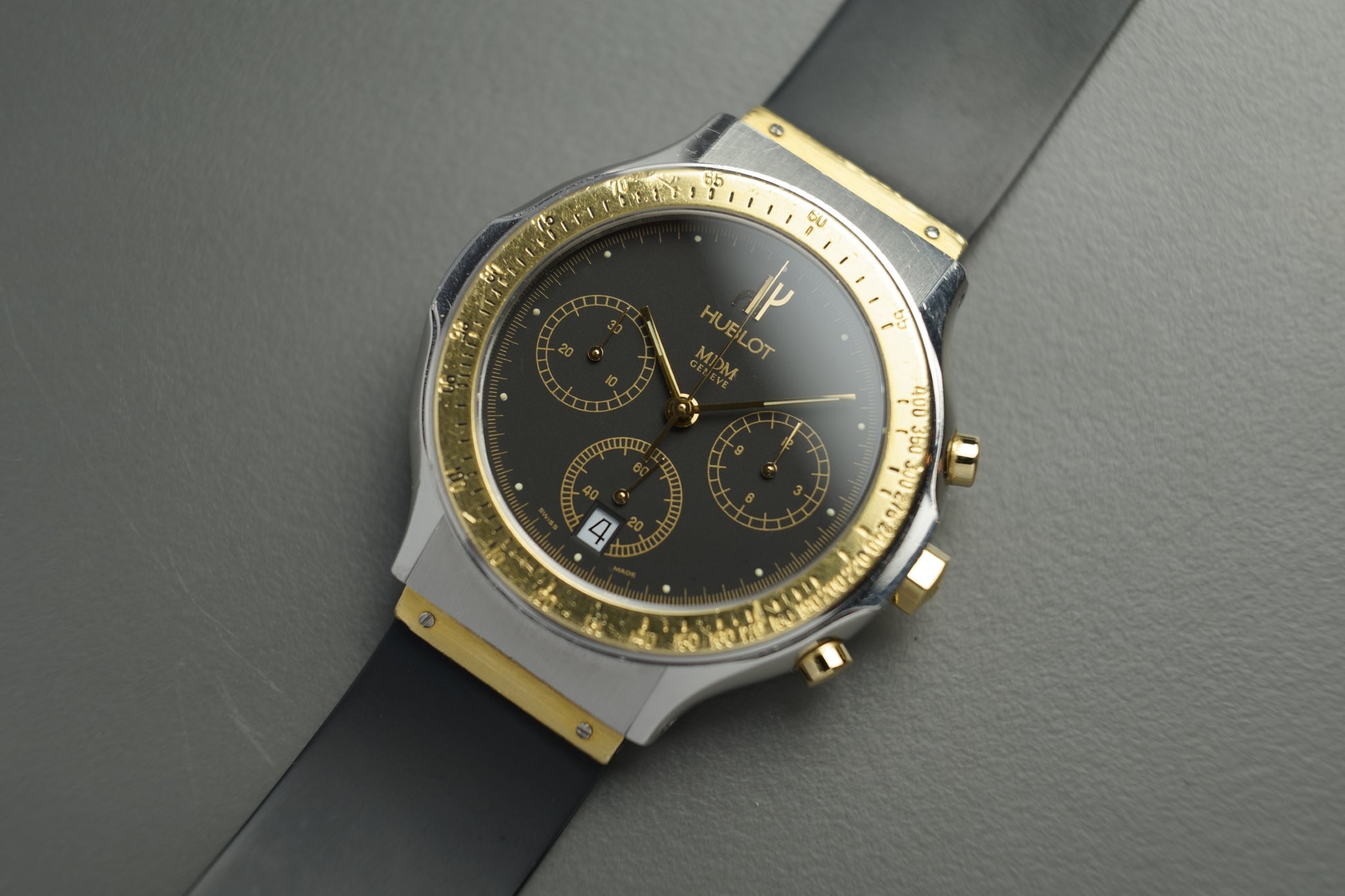 Die Uhr wird mit dem abgebildeten Etui geliefert und befindet sich in einem sehr guten Zustand – ideal für Liebhaber von klassischen Hublot-Modellen.
