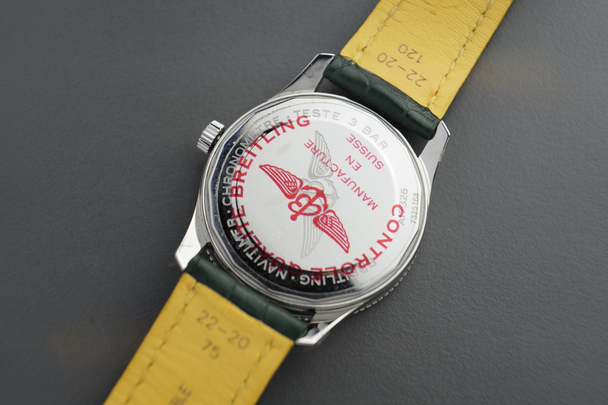 Werk: Breitling Kaliber 17, mechanisch, automatischer Aufzug, COSC-zertifiziert, ca. 38 Std. Gangreserve