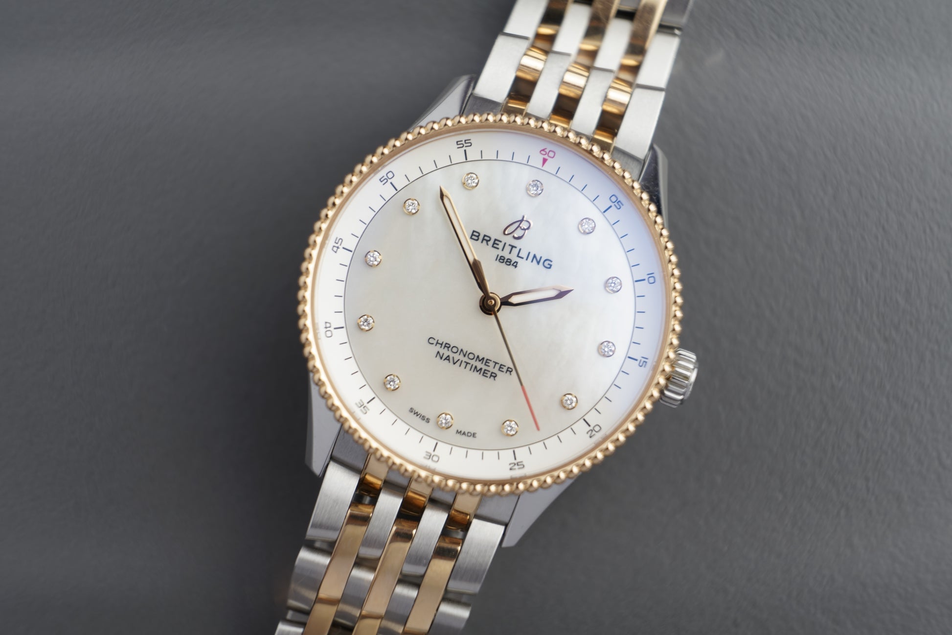 Zifferblatt: Perlmutt (Mother of Pearl), mit 12 Diamantindices als Stundenmarkierungen