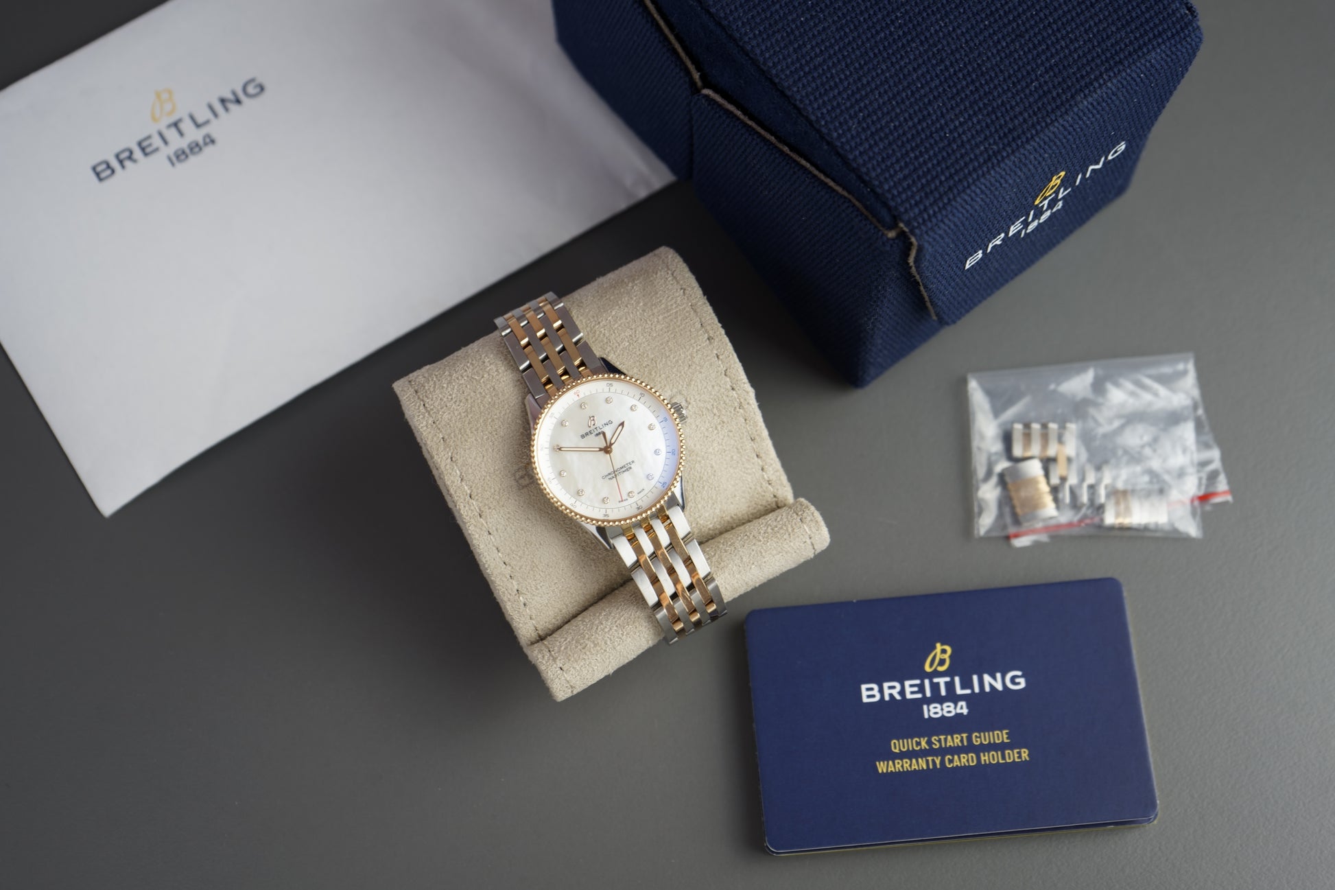 Diese edle Damenuhr verbindet luxuriöse Materialien mit technischer Präzision und zitiert dezent die DNA der Navitimer-Reihe – jedoch in einem schlankeren Format.