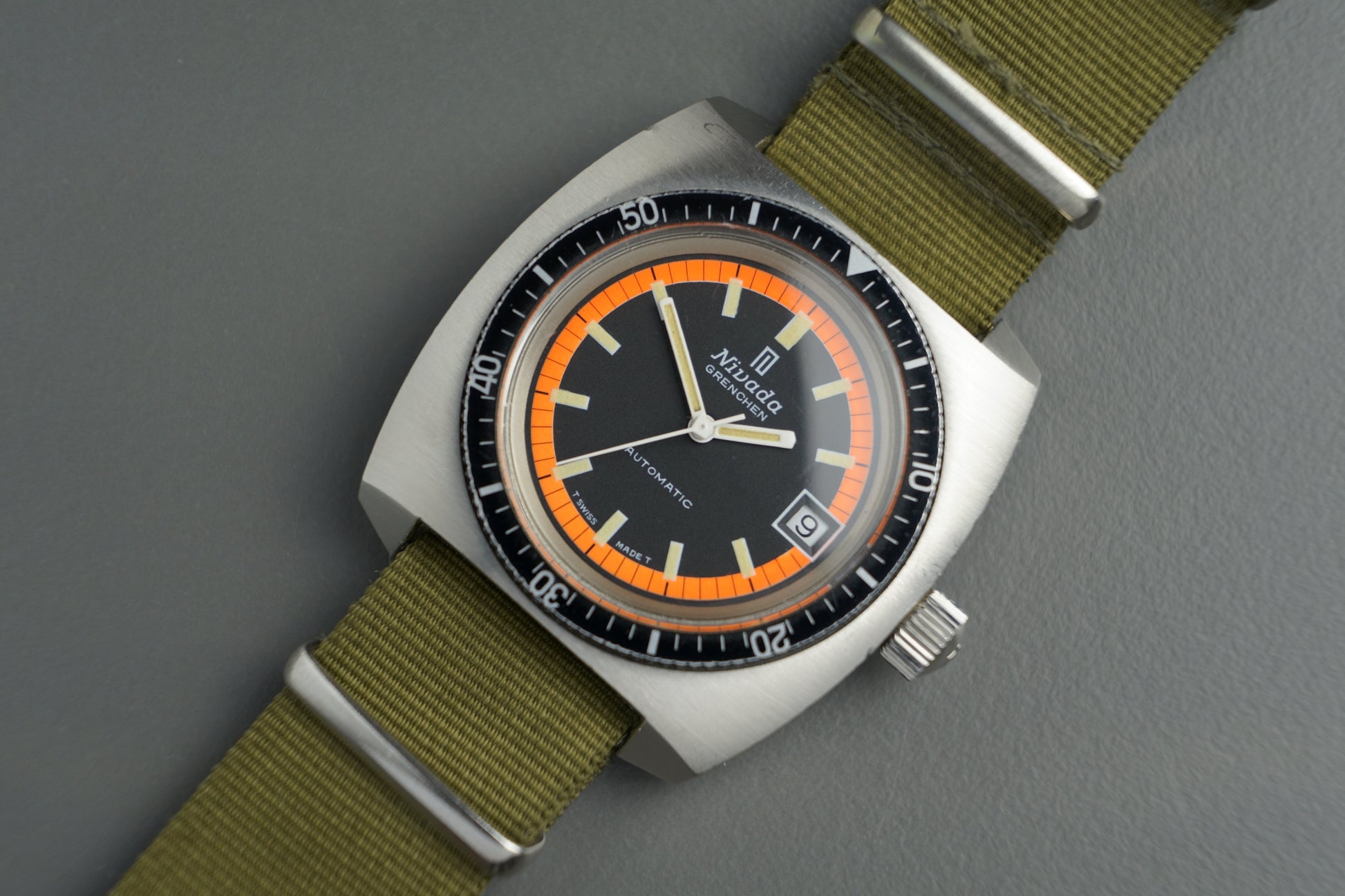 Hierbei handelt es sich um eine kultige Taucheruhr aus den 1970ern. Diese Nivada Grenchen ist ein zukünftiger Klassiker und in solch einem Zustand sehr selten.