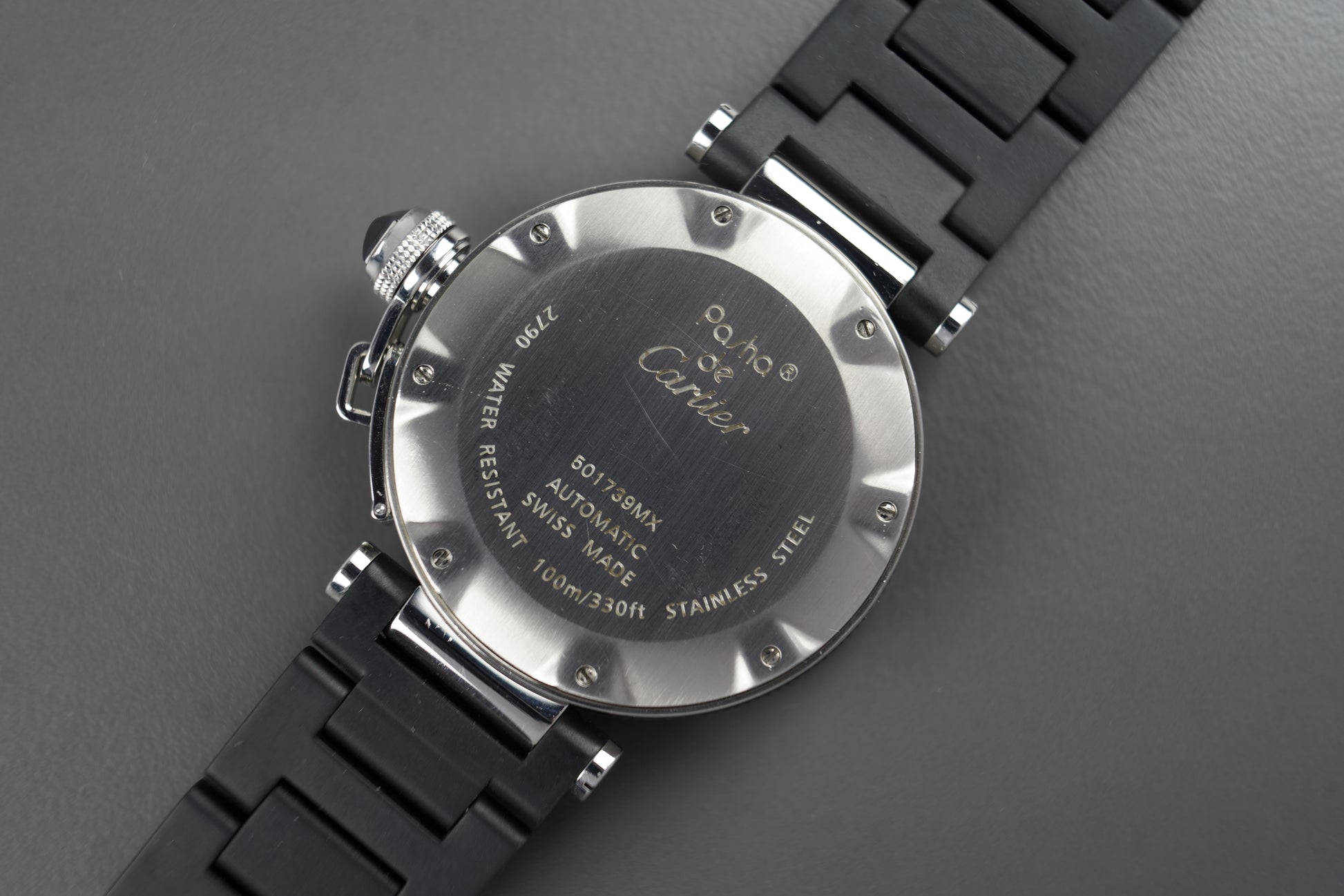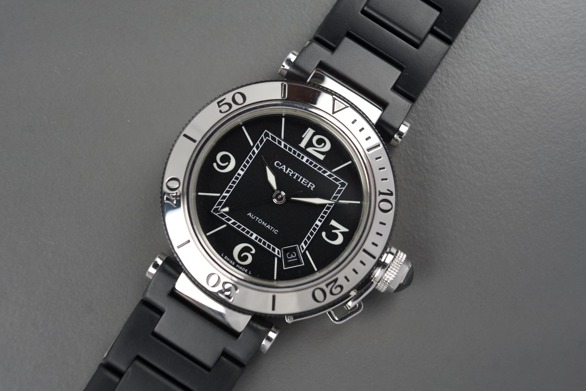 Hierbei handelt es sich um die elegante und zeitlose Cartier Pasha mit arabischen Ziffern in der Kautschuk-Ausführung.